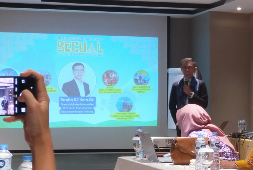 Jakarta, Jurnalbabel.com – Dunia pendidikan kembali menoleh ke Kepulauan Bangka Belitung ketika Suwito, Guru Informatika dari SMP Santa Maria Mentok, tampil membawakan inovasi pembelajaran BECUAL (Belajar Coding Melalui Alam) di ajang Apresiasi Guru dan Tenaga Kependidikan (GTK) Hari Guru Nasional 2025 di Jakarta.