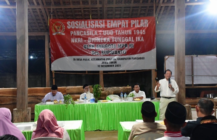 JurnalBabel.com – Anggota MPR/DPR RI Fraksi Partai Gerindra, Supriyanto, melakukan Sosialisasi Empat Pilar Kebangsaan MPR RI di Desa Patik, Kecamatan Pulung, Kabupaten Ponorogo, Jawa Timur, Jumat (12/12/2025).